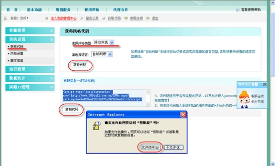 點擊“獲取代碼”按鈕,得到代碼,點擊“復(fù)制代碼”,選“允許訪問”,就把獲取的代碼復(fù)制好了,這時只要再粘貼“到網(wǎng)站的相關(guān)頁面的 </html> 的前一行”即可。