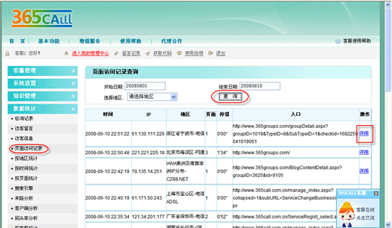 掌握真實(shí)有效的流量、咨詢量數(shù)據(jù),記錄流量和咨詢量數(shù)據(jù)及相互關(guān)系,為企業(yè)營銷提供參考數(shù)據(jù)。 頁面訪問記錄查詢: 登陸kf000在線客服系統(tǒng)網(wǎng)站,點(diǎn)擊“數(shù)據(jù)統(tǒng)計(jì)”->“頁面訪問記錄”,可選擇時間段,點(diǎn)擊“查詢”按鈕進(jìn)行查詢: