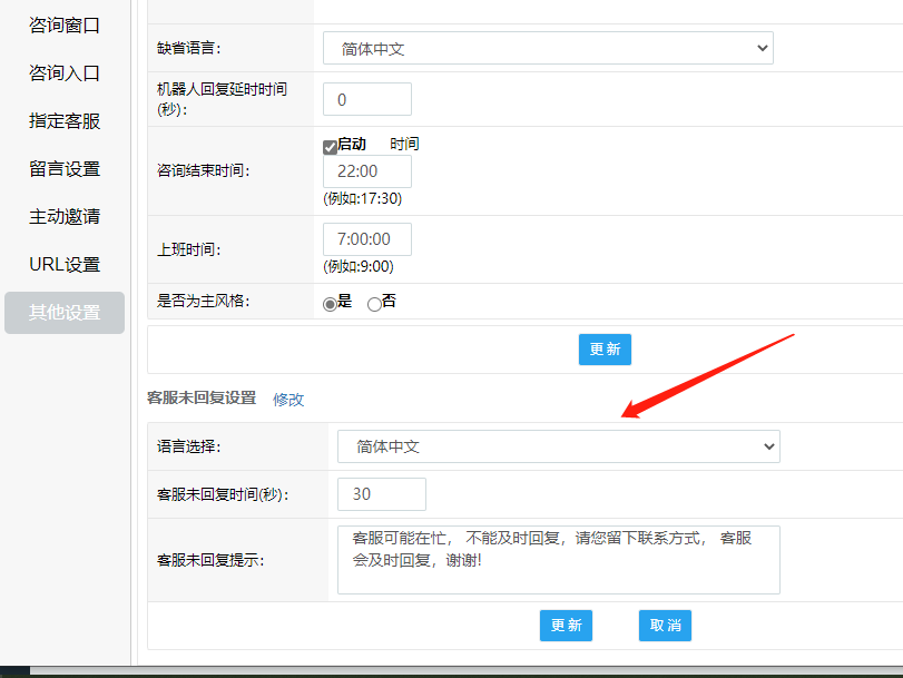 客服長(zhǎng)時(shí)間為回復(fù)訪客可提醒客服訪客等待時(shí)間過(guò)長(zhǎng),盡快恢復(fù),可在“系統(tǒng)設(shè)置-媒體對(duì)接-網(wǎng)頁(yè)(網(wǎng)站)-設(shè)置-其他設(shè)置”中開(kāi)啟設(shè)置