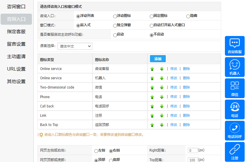 訪客可在客服休息時(shí)間或忙碌未及時(shí)回復(fù)時(shí)將自己的聯(lián)系方式留下,等待客服回呼解決問(wèn)題,可在“系統(tǒng)設(shè)置-媒體對(duì)接-網(wǎng)頁(yè)(網(wǎng)站)-設(shè)置-咨詢(xún)?nèi)肟凇?/span>